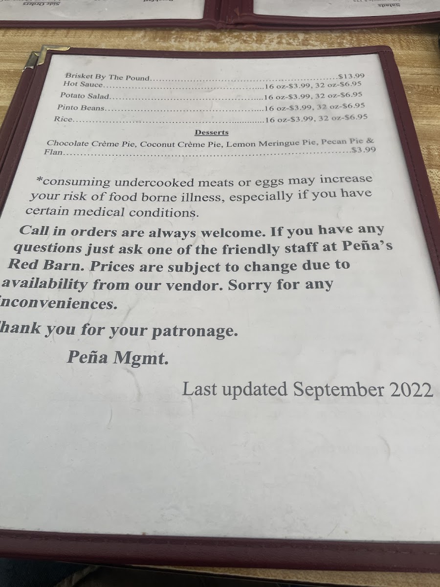 Welcome to Pena Red Barn Cafe, a beloved gem nestled in the heart of Bronte, TX. This family-friendly eatery is celebrated for its welcoming atmosphere and comforting dishes that blend Mexican, barbecue, and home-style cuisine. Customers rave about the flavorful chicken flautas and the rich Tex-Mex plates, particularly the standout cheese enchiladas that keep diners coming back for more.